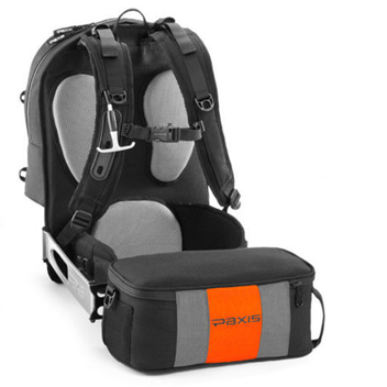 The brainchild of Paul Vierthaler, Paxis is a backpack that look like any other, but with two compartments for storing things. The top one stays in place. The bottom one, however, is mounted to an articulated arm. Pull a tab on the pack's front side and that compartment swings around to the front of your waist, providing easy access to its contents.
